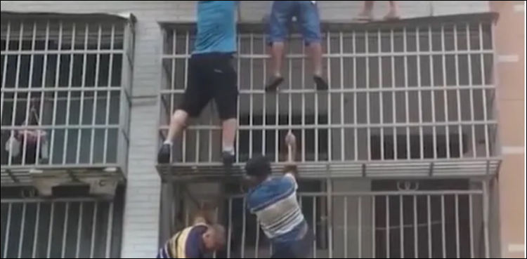 ویڈیو میں نظر آرہا ہے کہ اوپر کھڑے شخص نے عمارت کی کھڑکی سے ایک چھوٹی بچی کو باہر نکالا اور اپنے نیچے والے ساتھی کو تھما دیا اور اسی طرح بچی بحفاظت بلڈنگ سے باہر نکل پائی۔