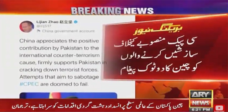 China appreciates the positive contribution by Pakistan to the international counter-terrorism cause, firmly supports Pakistan in cracking down terrorist forces. Attempts that aim to sabotage #CPEC are doomed to fail. pic.twitter.com/IQyGgwkVCw
