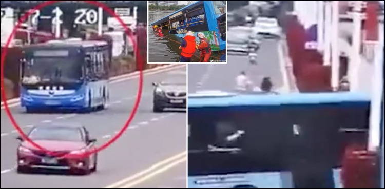 ویڈیو میں دیکھا جاسکتا ہے کہ چین کے جنوب مغربی شہر انشون میں ایک پل پر نیلے رنگ کی مسافر بس رواں دواں ہے اور اچانک ہی ڈرائیور کے قابو سے باہر ہوکر دوسری لین میں آتے ہوئے پل سے نیچے دریا میں گر جاتی ہے۔