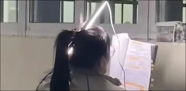چینی سوشل میڈیا سائٹ ویبو میں ایک ویڈیو وائرل ہوئی ہے جس میں ایک طالبہ ممکنہ طور پر یونیورسٹی نوٹس کے ڈھیر کے سامنے بیٹھی ہے اور ایک بڑی لائٹ اس کے بالوں میں پھنسی روشن ہے۔