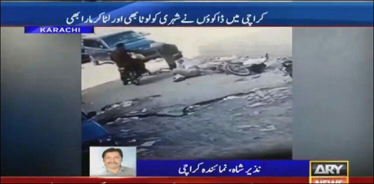 اے آر وائی نیوز کی رپورٹ کے مطابق کراچی کے علاقے ناظم آباد رضویہ تھانے کی حدود میں 2 موٹر سائیکل سوار ملزمان شہری کو تشدد کا نشانہ بنا کر نقدی و موبائل فون چھین کر فرار ہوگئے۔