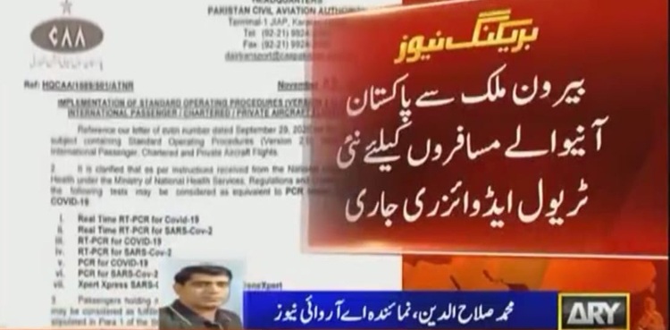 سول ایوی ایشن اتھارٹی نے مسافروں کی سہولت کے لیے7 ٹیسٹوں کو پی سی آر کورونا ٹیسٹ کے مساوی قرار دے دیا، سات میں کسی بھی ایک ٹیسٹ کی منفی رپورٹ لازمی قرار دی گئی ہے۔