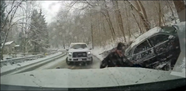 غیرملکی خبررساں ادارے کی رپورٹ کے مطابق امریکی ریاست پنسلوانیا میں سڑک پر برفباری کے باعث پھسلن کے دوران ٹرک ڈرائیور کے قابو سے باہر ہوگیا جس کے نتیجے میں وہاں موجود مدد کے لیے کھڑے افراد حادثے سے بال بال بچ گئے۔