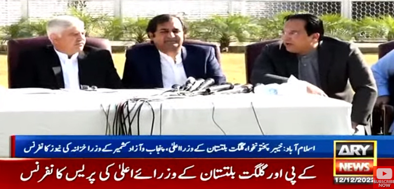 اے آر وائی نیوز کے مطابق وزیراعلیٰ خیبرپختونخوا محمود خان، وزیراعلیٰ گلگت بلتستان خالد خورشید اور آزاد کشمیر کے وزیر خزانہ نے اسلام آباد میں مشترکہ پریس کانفرنس کرتے ہوئے وفاقی حکومت پر اپنی حکومتوں کے فنڈز روک کر دیوار سے لگانے کے الزامات عائد کیے ہیں اور متنبہ کیا ہے کہ اگر ہمارے فنڈز جاری نہ کیے ہڑتال کریں گے یا عوام کو لے کر اسلام آباد آئیں گے۔