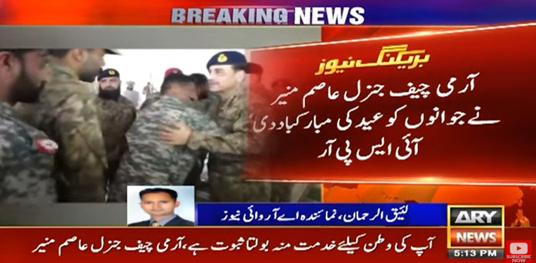 ترجمان پاک فوج کا بتانا ہے کہ آرمی چیف جنرل عاصم منیر نے جوانوں کو عید کی مبارک باد دی۔
