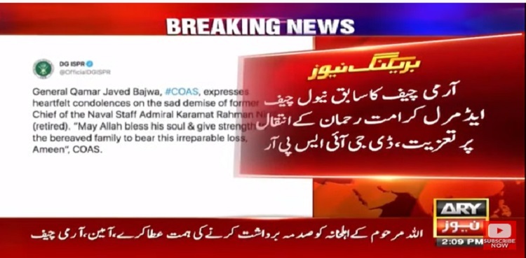 General Qamar Javed Bajwa, #COAS, expresses heartfelt condolences on the sad demise of former Chief of the Naval Staff Admiral Karamat Rahman Niazi (retired). “May Allah bless his soul & give strength to the bereaved family to bear this irreparable loss, Ameen”, COAS.