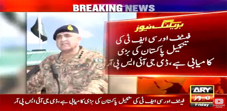 پاک فوج کے شعبہ تعلقات عامہ (آئی ایس پی آر) کے مطابق فنانشل ایکشن ٹاسک فورس (ایف اے ٹی ایف) کی تکمیل پاکستان کی بڑی کامیابی ہے، جی ایچ کیو میں قائم کورسیل اور قومی کوششوں سے یہ ممکن ہوا۔
