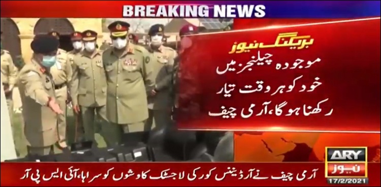 پاک فوج کے سپہ سالار نے کہا کہ جدید جنگی تقاضوں اور رجحانات میں ہروقت تیار رہنا ضروری ہے، موجودہ چیلنجز میں خود کو ہر وقت تیار رکھنا ہوگا۔
