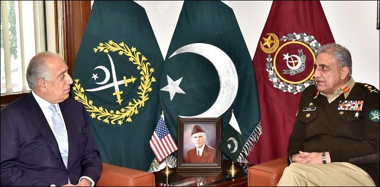 پاک فوج کے سپہ سالار کا کہنا تھا کہ پاکستان خطے میں امن و استحکام کے لیے اپنا مثبت کردار ادا کرتا رہے گا، دوسری جانب زلمے خلیل زاد کی خطے میں فروغ امن کے لیے پاکستان کے کردار کی تعریف کی۔