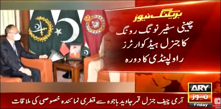 پاک فوج کے شعبۂ تعلقاتِ عامہ (آئی ایس پی آر) کی جانب سے جاری اعلامیے کے مطابق چینی سفیر نے جنرل ہیڈ کوارٹرز راولپنڈی کا دورہ کیا، جہاں آرمی چیف جنرل قمرجاویدباجوہ نے اُن سے ملاقات کی۔