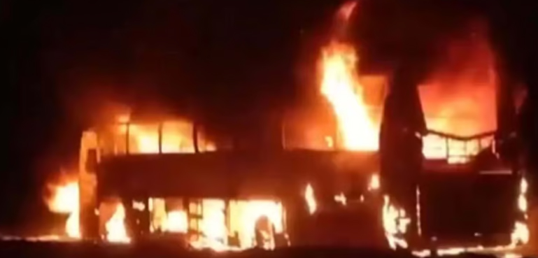 بھارت میں ووٹ ڈال کر واپس جانے والوں کی بس میں خوفناک حادثے کے بعد آگ بھڑک اٹھی 6 افراد جھلس کر ہلاک ہو گئے۔
