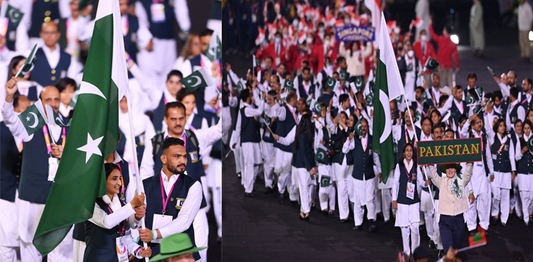 تفصیلات کے مطابق برمنگھم میں کامن ویلتھ گیمزکی افتتاحی تقریب میں قومی دستے کا مارچ پاسٹ ہوا، قومی دستے کی قیادت ریسلرانعام بٹ ، خواتین کرکٹ ٹیم کی کپتان بسمہ معروف نےکی۔