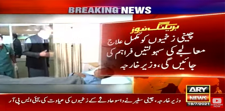 آئی ایس پی آر کے مطابق وزیرخارجہ شاہ محمودقریشی اور چینی سفیر نے سی ایم ایچ راولپنڈی کادورہ کیا جہاں انہوں نے داسوحادثےکےچینی زخمیوں کی عیادت کی۔