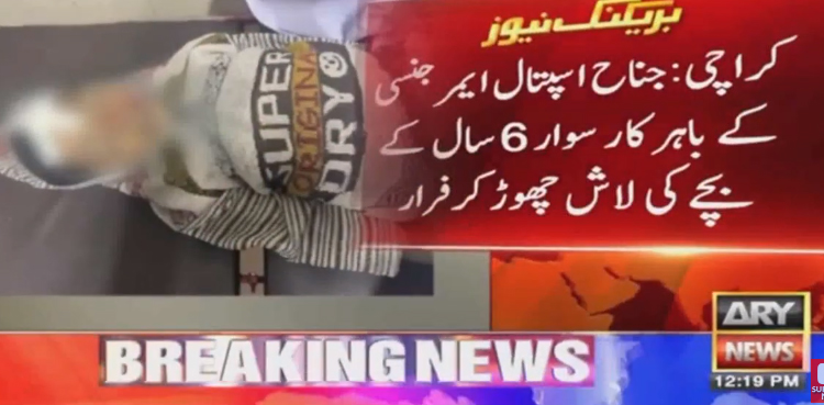 جناح اسپتال میں بچے کی لاش چھوڑ کر فرار ہونے والے مشتبہ افراد کی سی سی ٹی وی فوٹیج حاصل کر لی گئی، ویڈیو میں ہری ٹی شرٹ پہنے نوجوان کو فون پر باتیں کرتے دیکھا جا سکتا ہے۔