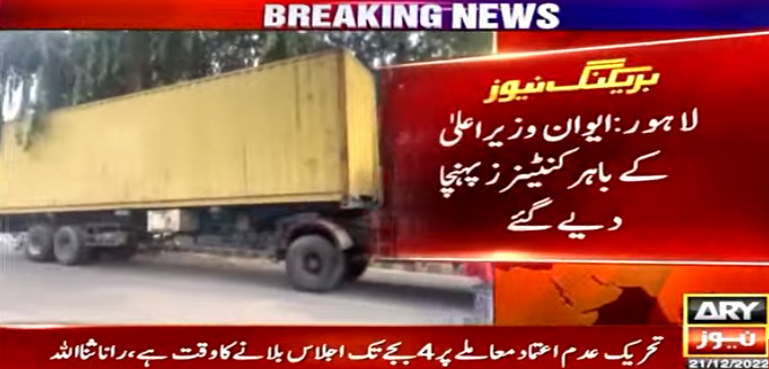 آج بعد دوپہر ایوان وزیراعلیٰ کے باہر کنٹینرز پہنچا دیے گئے ہیں جب کہ کسی کو نہیں معلوم ہے کہ یہ کنٹینر کس نے منگوائے ہیں۔