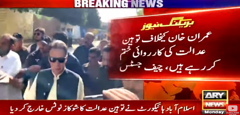 اسلام آباد ہائیکورٹ کے چیف جسٹس اطہر من اللہ نے کہا کہ ہم نے آپ کا بیان حلفی پڑھا ہے، کچھ اور کہنا چاہتے ہیں؟ بادی النظر میں یہ توہین عدالت تھی لیکن عمران خان نے نیک نیتی ثابت کی اور معافی مانگنے گئے، ہم توہین عدالت کا نوٹس خارج کرکے کارروائی ختم کر رہے ہیں، یہ لارجر بینچ کا متفقہ فیصلہ ہے اور ہم عمران خان کے کنڈیکٹ سے بھی مطمئن ہیں، جس کے بعد عدالت نے توہین عدالت کا شوکاز نوٹس خارج کرتے ہوئے کارروائی ختم کرنے کا حکم دیا۔