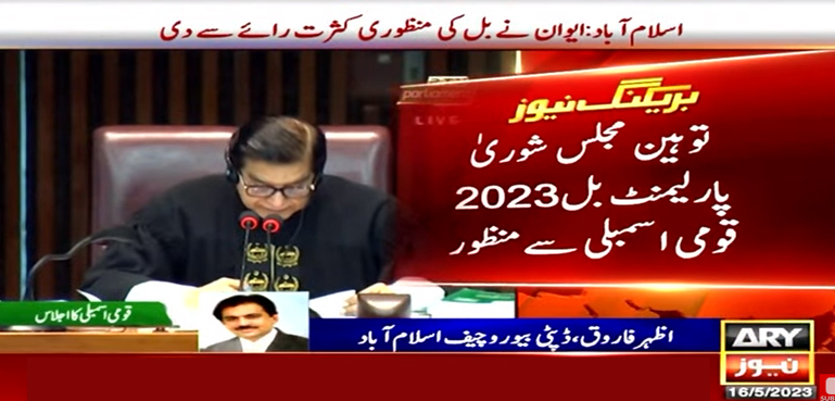 توہین پارلیمنٹ (مجلس شوریٰ) بل 2023 کو قومی اسمبلی میں منظور کر لیا گیا ہے اراکین کی اکثریت نے اس بل کے حق میں ووٹ دیا۔
