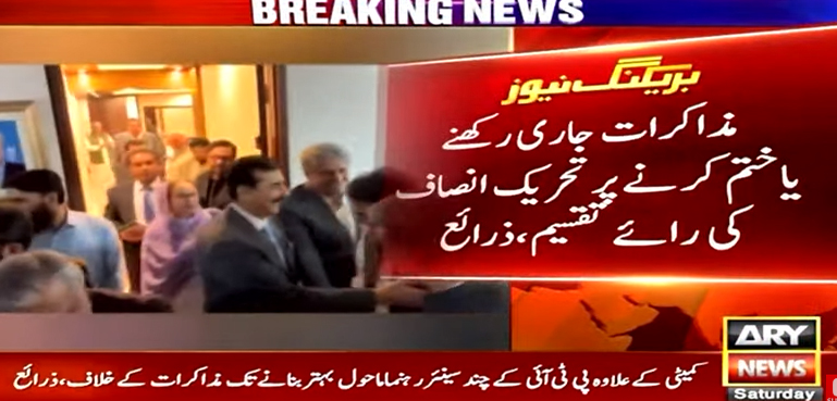 ملک میں بیک وقت الیکشن کے معاملے پر حکومتی اتحاد سے جاری مذاکرات جاری رکھنے یا ختم کرنے کے معاملے پر پی ٹی آئی کی رائے تقسیم ہوگئی ہے۔