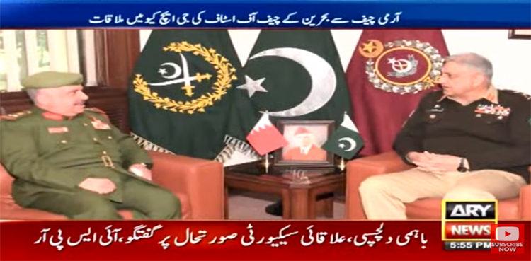 آئی ایس پی آر کے مطابق آرمی چیف سے بحرین کےچیف آف اسٹاف نے جی ایچ کیو میں ملاقات کی جس میں باہمی دلچسپی کے امور اور علاقائی سیکیورٹی صورتحال پر گفتگو کی گئی۔