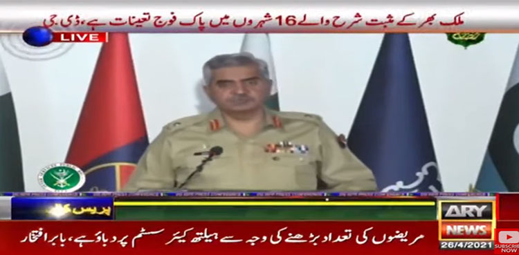 ڈی جی آئی ایس پی آر نے میڈیا بریفنگ دیتے ہوئے کہا کہ کورونا مثبت کیسزکی شرح خطرناک حدتک بڑھ گئی ہے 23اپریل کو 157 افراد کورونا کی وجہ سےاپنی زندگی سےمحروم ہوگئے اس وقت 570 افراد وینٹی لیٹرز پر ہیں اور 4 ہزار سے زائدکی کشیدہ صورتحال ہے۔
