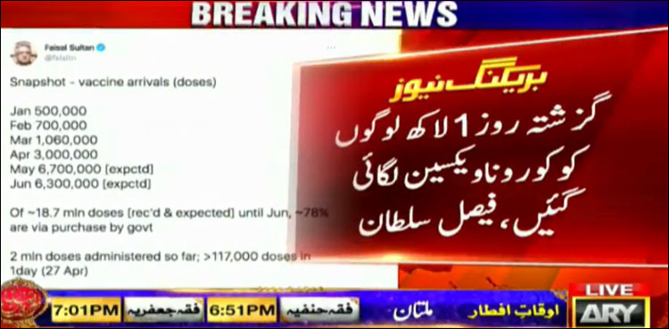 ڈاکٹر فیصل سلطان نے بتایا کہ اپریل میں 30 لاکھ ویکسین آئیں جبکہ مئی میں 67 لاکھ ویکسین اور جون میں 63 لاکھ ویکسین کی پاکستان آمد متوقع ہے۔
