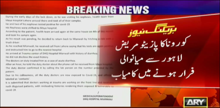 فرار مریض کورونا رپورٹ آنے سے قبل ہی بذریعہ ٹرک لاہورسےمیانوالی پہنچا ، جس کے بعد اسے فون پربتایا گیا لاہورمیں ہونے والا ٹیسٹ پازیٹو آیا ہے اور قریبی اسپتال سےفوری رجوع کرنےکاکہاگیا۔