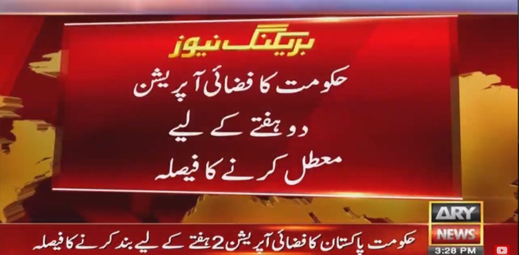 اسلام آباد : حکومت پاکستان نے کرونا وائرس کی روک تھام کےلیے بڑا قدم اٹھالیا، وزیر اعظم پاکستان عمران خان کی ہدایات پر فضائی آپریشن دو ہفتے کےلیے معطل کرنے کا فیصلہ کرلیا۔