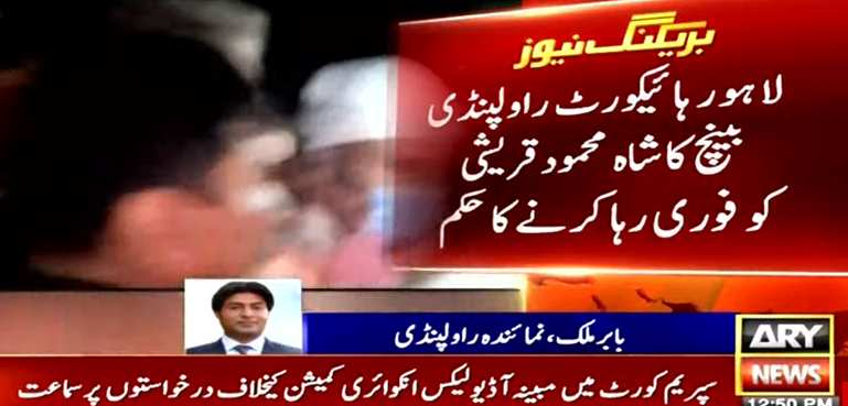اے آر وائی نیوز کے مطابق لاہور ہائیکورٹ کی راولپنڈی بینچ نے پاکستان تحریک انصاف کے سینیئر وائس چیئرمین شاہ محمود قریشی کو فوری طور پر رہا کرنے کا حکم دیا ہے اور ساتھ ہی کہا ہے کہ انہیں کسی اور ایم پی او آرڈر کے تحت گرفتار نہ کیا جائے۔