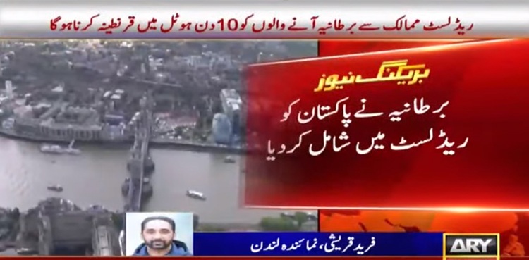 تفصیلات کے مطابق کورونا وائرس کی تیسری لہر نے پوری دنیا کولپیٹ میں لیا ہوا ہے ، کورونا کیسز میں اضافے کے پیش نظر برطانیہ نے پاکستان کو ریڈ لسٹ میں شامل کردیا، جس کے بعد 9اپریل سےپاکستان سےبرطانیہ آنےوالوں کو10دن ہوٹل قرنطینہ کرناہوگا۔