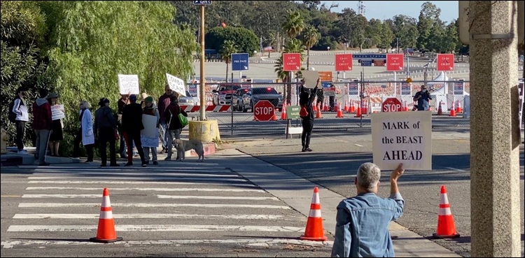 مظاہرین نے کرونا سینٹر پر جمع ہو کر ویکسی نیشن کو سازش قرار دیتے ہوئے شدید نعرے بازی کی، مظاہرین میں زیادہ تعداد ٹرمپ کے حامیوں کی تھی جنھوں نے پلے کارڈز اٹھا رکھے تھے۔