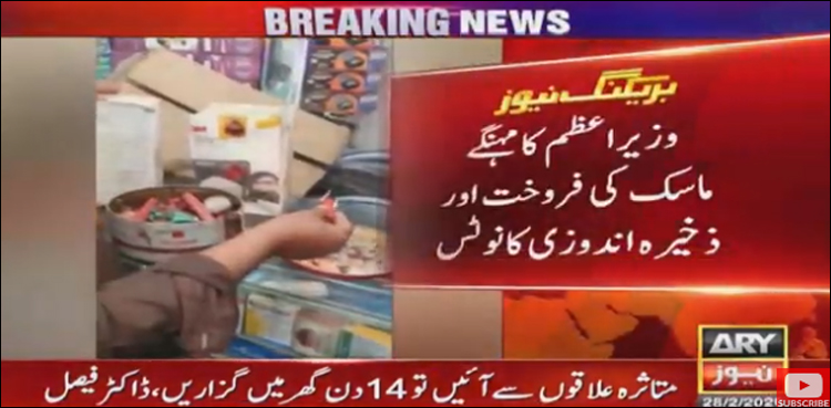 راولپنڈی میں 12 روپے والا ماسک چالیس روپے میں فروخت ہورہا تھا، انتظامیہ نے فیکٹری سے 20 ہزار ماسک برآمد کرلیے۔ علاوہ ازیں وزیراعظم کی ہدایت پر دیگر شہروں میں بھی ٹیم نے ذخیرہ اندوزوں کے خلاف کریک ڈاؤن شروع کردیا۔