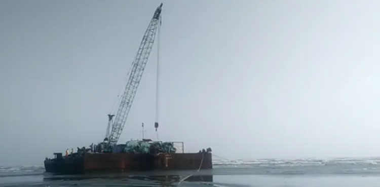 کراچی : ساحل پر پھنسے جہاز کو نکالنے والی کرین بردار بوٹ کے بھی اینکرز خراب ہوگئے اور کرین بردار بوٹ بھی ساحل پرپھنس گئی۔
