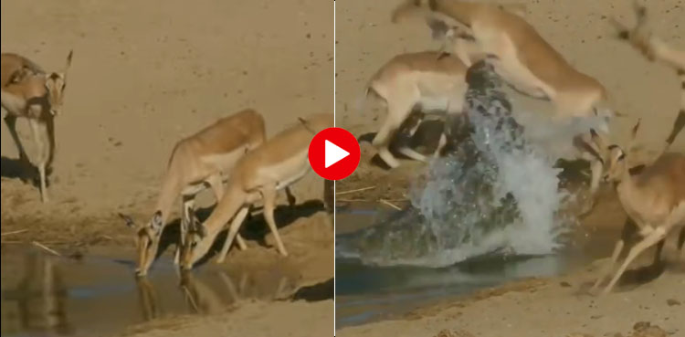 اس دوران اچانک ہی ایک مگرمچھ پانی کے اندر سے نکلتا ہے اور ہرنوں پر حملہ کردیتا ہے کہ بہت سے ہرن خوف کے مارے وہاں سے بھاگنے میں کامیاب ہوجاتے ہیں۔