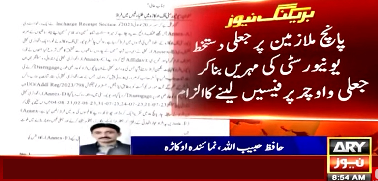 یونیورسٹی کے پانچ ملازمین پر جعلی دستخط اور جامعہ کی مہریں بنا کر جعلی واؤچر پر فیسیں لینے کا الزام ہے۔ ملزم ملازمین شاہد حسین، شاہدعباس، محمد مبین، مدین علی، انیس احمد کے یونیورسٹی آنے پر پابندی عائد کر دی گئی ہے۔