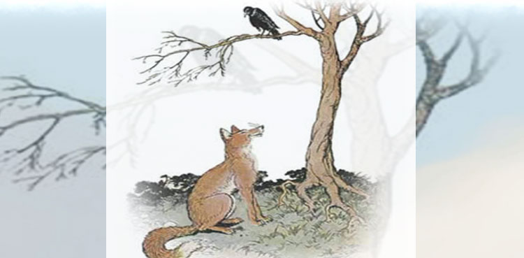 کوّا اس وقت چونکا جب لومڑی نے اس کی طرف دیکھتے ہوئے اچانک واہ وا شروع کردی۔ وہ ایک سانس میں بولے جارہی تھی کہ سبحان اللہ جیسی تیری صورت ہے، ویسی ہی سیرت بھی تُو نے پائی ہے۔ تیرے پر کیا خوش رنگ ہیں اور اس کی سیاہی کیسی چمک دار ہے۔ تیرے گلے پر کیسا اجلا نشان ہے اور تیری چونچ کتنی مضبوط اور حسین ہے۔