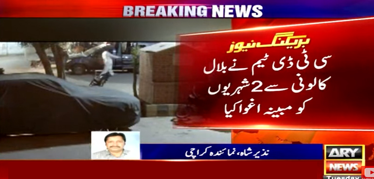 اے آر وائی نیوز کے مطابق انچارج سی ٹی ڈی انٹیلیجنس شعیب قریشی پر شہریوں کو اغوا کا الزام ہے اور سی ٹی ڈی ٹیم نے بلال کالونی سے دو شہریوں کو مبینہ اغوا کیا جس کی سی سی ٹی وی فوٹیج اے آر وائی نیوز نے حاصل کرلی ہے۔