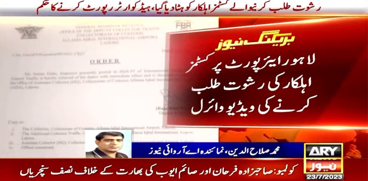 رشوت طلب کرنے والے کسٹمز اہلکار کو ہٹاتے ہوئے اسے ہیڈ کوارٹر رپورٹ کرنے کا حکم دیا گیا ہے، ویڈیومیں کسٹمز اہلکارعمران کو مسافر سے تکرار کرتے دیکھاجاسکتا ہے۔
