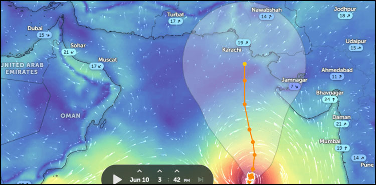 محکمہ موسمیات کے مطابق طوفان نے پچھلے 12 گھنٹوں میں کراچی سے 600 کلو میٹر فاصلے کا سفر طے کیا ہے، اس کا رخ 14 جون تک شمال کی جانب ہوگا، 15 جون کی دوپہر طوفان شمال مشرق کی جانب ہو کر سندھ کیٹی بندر اور انڈین گجرات کی ساحلی پٹی سے ٹکرا جائے گا۔