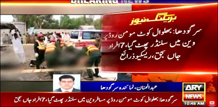 تفصیلات کے مطابق سرگودھا میں بھلوال کوٹ مومن روڈ پر ایک چلتی وین میں سلنڈر پھٹ گیا، جس کے باعث سات مسافر جھلس کر جاں بحق ہو گئے ہیں۔