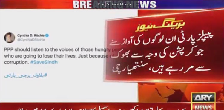 تفصیلات کے مطابق پیپلزپارٹی قیادت پر الزامات لگانےوالی امریکی بلاگر سنتھیا رچی نے سماجی رابطے کی ویب سائٹ ٹوئٹر پر اپنے پیغام میں کہا ہے کہ پیپلزپارٹی ان لوگوں کی آوازسنےجوکرپشن کی وجہ سےبھوک سےمررہے ہیں۔