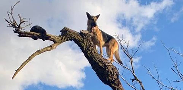 بلی کا پیچھا کرتے کرتے جرمن شیفرڈ بھی درخت کی سب سے اونچی ٹہنی پر جا پہنچا مگر اسے معلوم ہی نہیں تھا کہ وہ نیچے کیسے اترے گا۔
