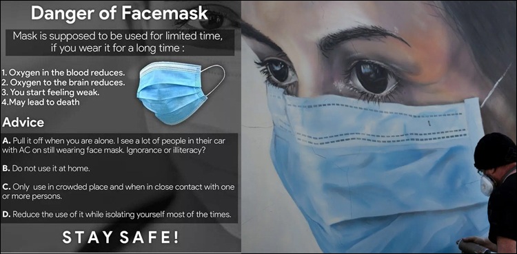 سماجی رابطے کی ویب سائٹس پر ان دنوں چند تصاویر وائرل ہورہی ہیں جن میں بتانے کی کوشش کی جارہی ہے کہ کرونا سے بچاؤ کے لیے ماسک لگانا انسانی صحت کے لیے خطرناک ہے۔