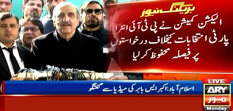 اے آر وائی نیوز کے مطابق پی ٹی آئی انٹرا پارٹی انتخابات کے خلاف درخواستوں پر چیف الیکشن کمشنر کی سربراہی میں 5 رکنی بینچ نے سماعت کی۔ اس موقع پر عبوری چیئرمین پی ٹی آئی بیرسٹر گوہر علی اور پارٹی کے وکیل بیرسٹر علی ظفر اور نیاز اللہ نیازی بھی کمرہ عدالت میں موجود تھے جب کہ اکبر ایس بابر سمیت انٹرا پارٹی الیکشن کے خلاف متعدد درخواست گزار بھی پیش ہوئے۔