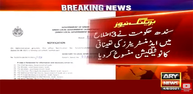 سندھ حکومت نے تین اضلاع میں ایڈمنسٹریٹرز کی تعیناتی کا نوٹیفکیشن منسوخ کردیا۔