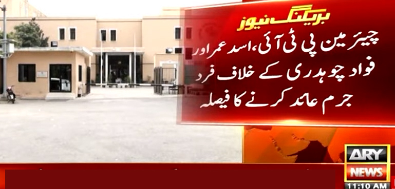 کمیشن نے پی ٹی آئی کے اعتراضات پر محفوظ فیصلہ سنا دیا اور تمام اعتراضات مسترد کرتے ہوئے چیئرمین پی ٹی آئی، سابق وفاقی وزرا اسد عمر اور فواد چوہدری کیخلاف فرد جرم عائد کرنے کا فیصلہ کیا ہے۔