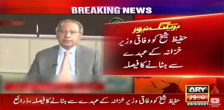 حفیظ شیخ کو وزیرخزانہ کے عہدے سے ہٹانے کا فیصلہ کابینہ میں تبدیلیوں کی ایک کڑی ہے۔ حفیظ شیخ کی جگہ حماداظہر کو نیا وزیر خزانہ مقرر کیا جائے گا۔