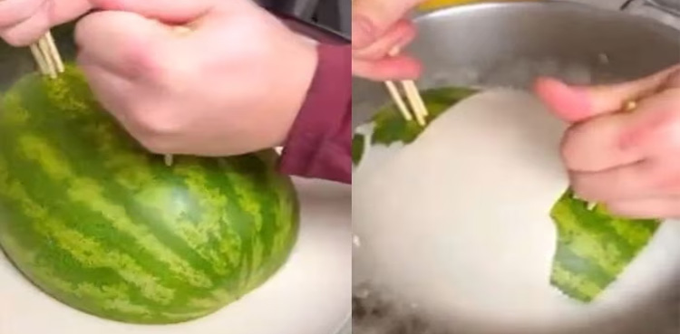 اس ویڈیو کلپ میں دکھایا گیا ہے کہ ایک شخص تربوز پکڑنے کیلیے سیخوں کا استعمال کرتا ہے جو اس میں پھنسائی گئی ہیں، اس کے بعد وہ تربوز کو ایک محلول میں مکمل طور پر ڈبو دیتا ہے۔