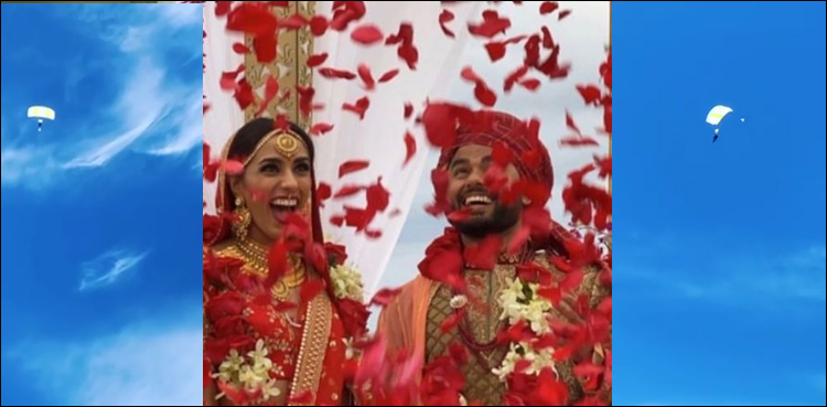 میڈیا رپورٹ کے مطابق بھارتی شہری آکاش یادیو نے اپنی شادی کو یادگار بنانے کے لیے 13 ہزار فٹ کی بلندی سے چھلانگ لگائی اور اسکائی ڈائیونگ کر کے اپنی بارات میں شرکت کی۔ نوجوان نے اس لمحے کو یادگار بنانے کے لیے فوٹوگرافرز کی خدمات بھی حاصل کیں، دلہا کی جہاز سے چھلانگ لگا کر اپنی ہی بارات میں شرکت کی ویڈیو کو دیکھ کو سوشل میڈیا صارف دنگ رہ گئے۔