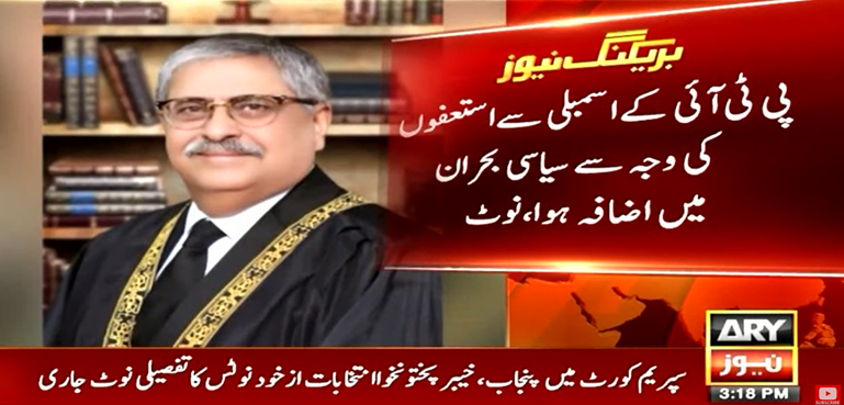 جسٹس اطہر من اللہ نے یہ بھی کہا کہ پی ٹی آئی کے اسمبلی سے استعفوں کی وجہ سے سیاسی بحران میں اضافہ ہوا۔ پھر پی ٹی آئی نے پنجاب اور کے پی اسمبلیاں تحلیل کرنے کا فیصلہ کیا اور دونوں صوبوں میں انتخابات نہ کرانے پر متعلقہ ہائی کورٹس سے رجوع کیا گیا۔