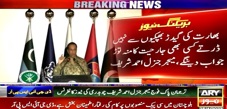 ترجمان پاک فوج میجر جنرل احمد شریف نے کہا ہے کہ بھارت کی گیدڑ بھپکیوں سے نہیں ڈرتے، کسی بھی جارحیت کا منہ توڑ جواب دیا جائے گا۔